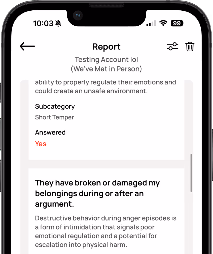 Get a clear summary of the emotional, behavioral, and safety red flags detected in your partner. Our system helps you learn what these signs mean — so you can make smarter, safer relationship decisions.